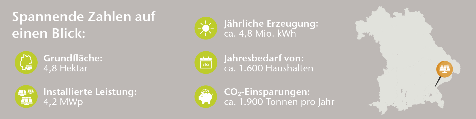 Die PV-Freiflächenanlage Burghausen entstand auf einer Fläche von etwa 4,8 Hektar mit knapp 7.000 installierten Modulen, welche zusammen eine Gesamtleistung von etwa 4,2 MWp ergeben. Dadurch produziert der PV-Park jährlich rund 4,8 Millionen kWh Ökostrom für die Bürgerinnen und Bürger der Stadt Burghausen und spart pro Jahr etwa 1.900 Tonnen CO2 ein – das entspricht rund 950 gepflanzten Bäumen. Das macht den Solarpark am Hieringer Feld zu einem zentralen Beitrag für die nachhaltige Energiezukunft.